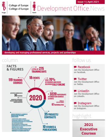 The College of Europe Development Office is proud to share with you its latest newsletter. Throughout the year, the College of Europe continued successfully fulfilling its mission by providing professional training courses as well services for international and EU institutions through its Development Office. These Facts & Figures give a global overview of the main achievements of 2020!