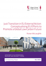 The Department of EU International Relations and Diplomacy Studies has published a new EU Diplomacy Paper entitled "Just Transition in EU External Action: Conceptualising EU Efforts to Promote a Global Low-Carbon Future" written by Ronan MCLAUGHLIN.